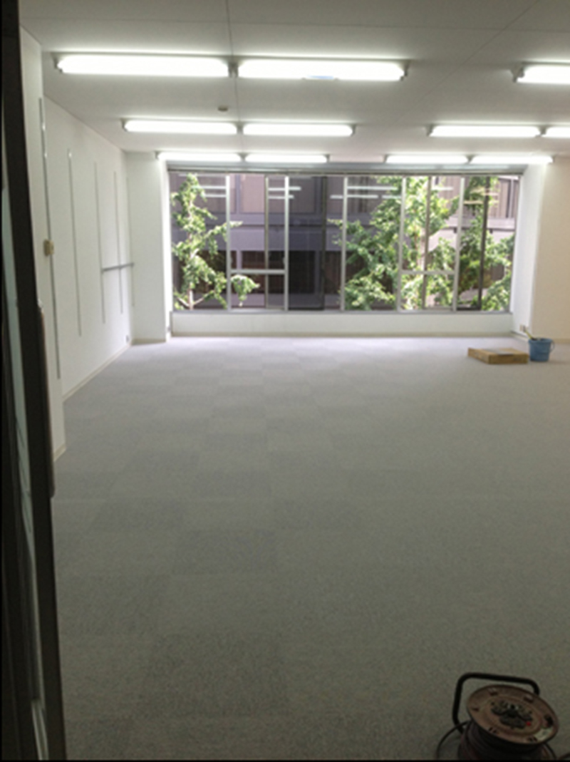 after現状はPタイル仕上げですが事務所として使うので遮音性に優れているタイルカーペットにしました。